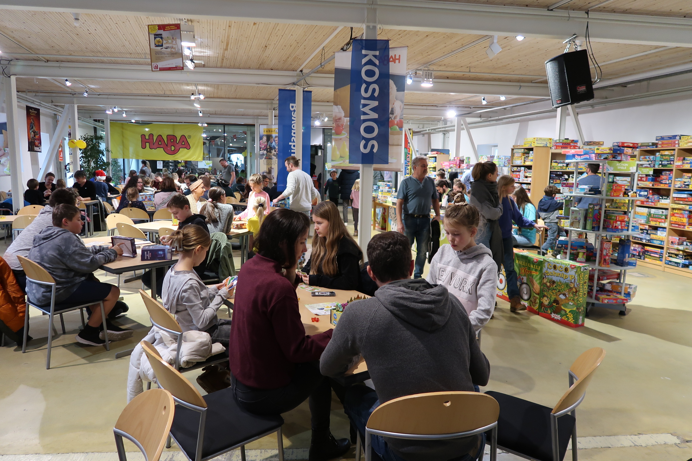 Es stehen viele verschiede Brett-, Action- und Kartenspiele zur Verfügung und die Kinder, Jugendlichen und Familien können vorbeikommen, diese ausprobieren und spielen.